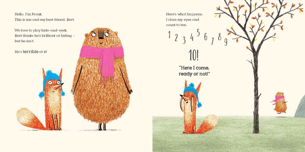 “Frank and Bert are the best of friends and they LOVE to play hide and seek. But Bert the bear isn’t quite as good at hiding as he thinks he is . . . and Frank ALWAYS wins! Every. Single. Time.
