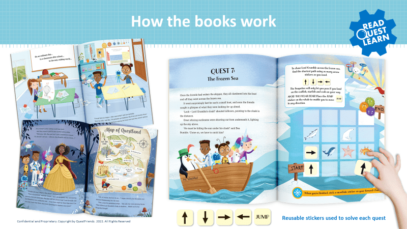 Our mission is to instil a love of STEM learning in all children in an inclusive, accessible and engaging way. Despite digital learning being commonplace in the home and classroom these days book are still the best medium to develop imaginative, creative learning anytime and anywhere – lying in bed, on the couch, in the garden, at the library, in class or on the move. In a world where children are exposed to screens on a daily basis, books provide a great outlet to give them a calm and focused time to learn. Our books are interactive but in a screen-free way allowing children to experience STEM learning first-hand and to promote active learning and retention of ideas and skills. Our books are designed for repeat use with elements like reusable stickers. Children can interact with them in new and creative ways each time. For example, we observed in our market research that once younger children have mastered the educational puzzles – called STEM quests – they can take on the role of teacher, explaining the story and quests to their siblings, friends or even stuffed toys, taking great pride in showing what they’ve learnt.