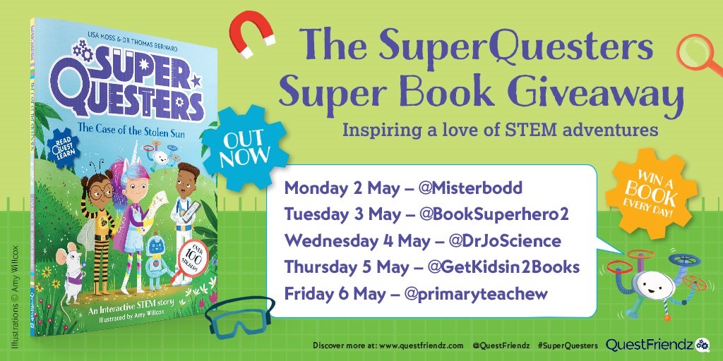 SuperQuesters: The Case of the Stolen Sun by STEM experts Dr Thomas Bernard and Lisa Moss (illustrated by Amy Willcox) publishes in paperback on 3 May from QuestFriendz. The second book in the series SuperQuesters: The Case of the Missing Memory will publish this autumn.